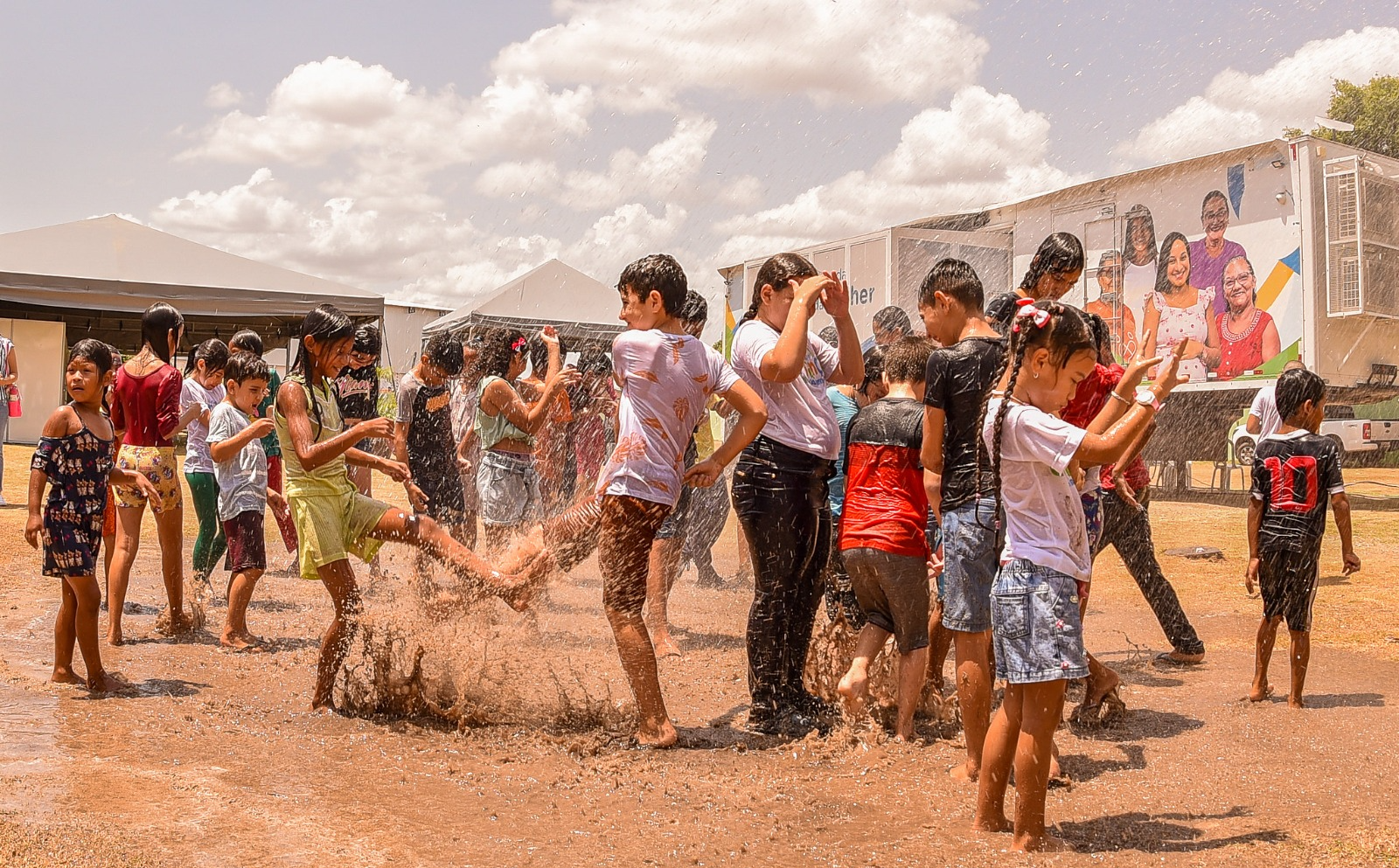 Representatividade infantil – No espaço lúdico, os membros do Comitê das Crianças exploraram a criatividade com atividades de pintura, incluindo a oportunidade de colorir o muro da escola e deixar a sua marca. Além disso, teve o famoso banho de caminhão pipa que trouxe frescor e tornou o momento ainda mais memorável.
