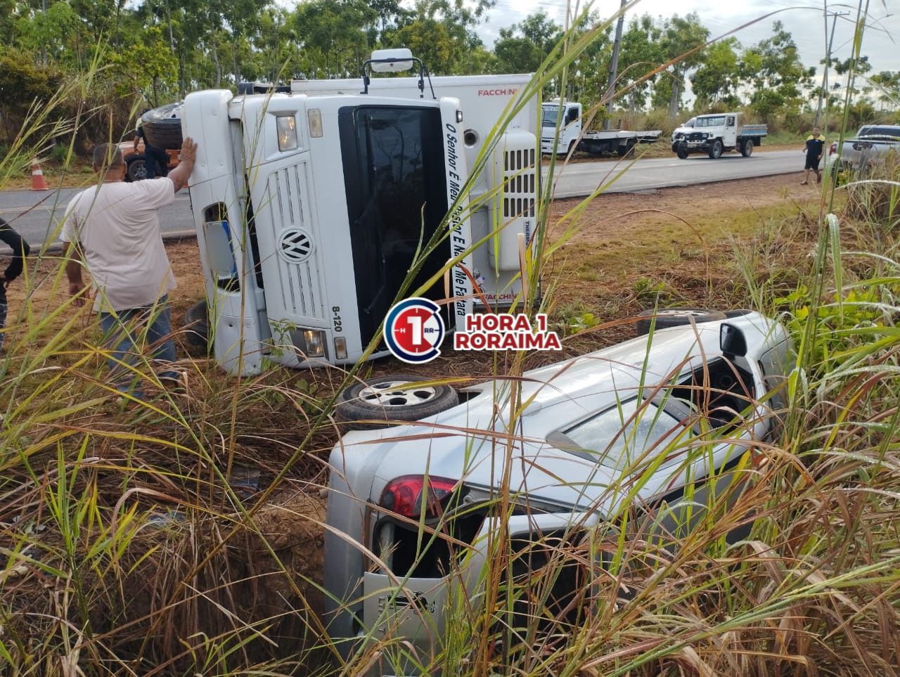 Na manhã desta quarta-feira, um caminhão azul que transportava ferro velho, de placa JWX 8I85, parou para verificar um carro de passeio prata que havia caído em uma vala ao lado da avenida principal que liga o bairro João de Barro à Cidade Satélite. Logo atrás, um caminhão baú branco reduziu a velocidade na curva e, ao tentar frear, percebeu que colidiria com a traseira do caminhão azul. Para evitar a colisão, o motorista jogou o veículo para o acostamento, mas devido ao peso da carga, o caminhão tombou. Felizmente, tanto o motorista quanto o ajudante não sofreram ferimentos graves.