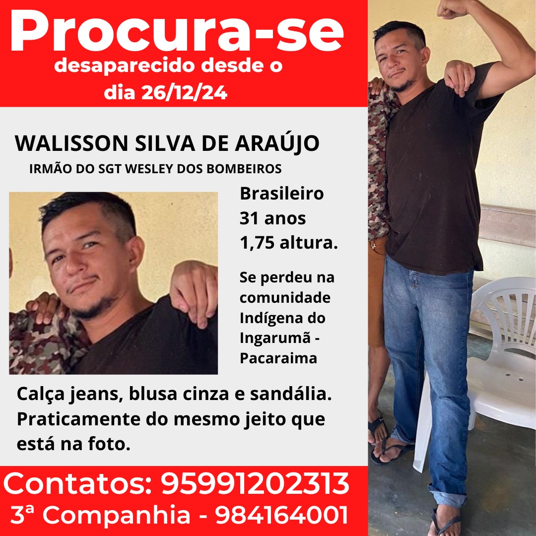 Na comunidade indígena do Ingarumã, localizada no município de Pacaraima, um homem de 31 anos desapareceu após uma reunião em família no Natal. Walisson Silva de Araújo, brasileiro, foi visto pela última vez vestindo calça jeans azul, blusa cinza e sandália.